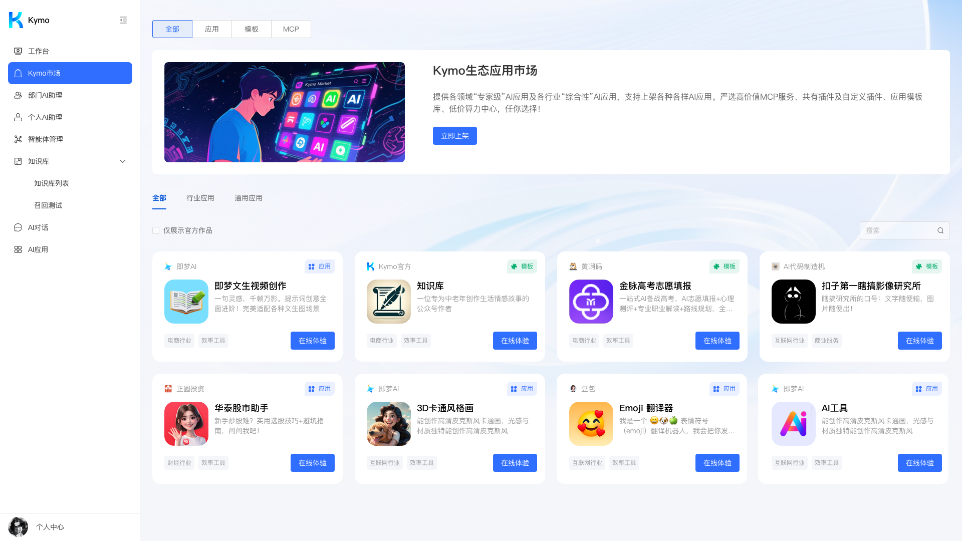 Kymo AI生产平台以“连接+管理”双轮驱动,将AI技术嵌入知识库全生命周期,凭借模块化架构、低代码开发、企业级知识引擎三大优势,实现知识库从“被动存储”到“主动赋能”的转型,核心能力体现在三方面: