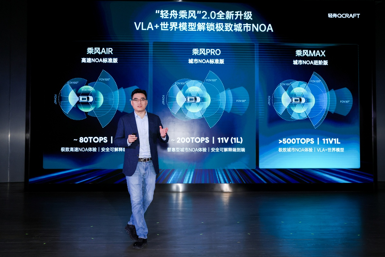 伴随行业首个单征程6M城市NOA正式上车,轻舟正式发布新一代“轻舟乘风2.0”辅助驾驶解决方案,形成三级产品矩阵:“乘风AIR”基于安全可解释端到端技术打造,提供极致高速NOA体验,约80TOPS算力,采用7V传感器配置;“乘风PRO”基于安全可解释端到端技术打造,提供普惠型城市NOA体验,约200TOPS算力,采用11V或11V1L传感器配置;“乘风MAX”全新推出城市NOA进阶版,大于500TOPS算力,采用11V1L传感器配置,深度融合VLA与世界模型技术,致力于打造极致城市NOA驾乘体验。