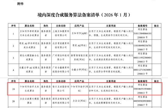 2026年1月7日,国家互联网信息办公室发布第十五批境内深度合成服务算法备案公告,每日互动“个知写作助手文本生成算法”正式通过备案。该算法遵循“可控、可靠、可信、可用”原则,在安全性、透明度与合规性方面已满足国家相关规定,标志着其在政务、媒体、企业等写作场景中的应用具备了规范的法定基础。