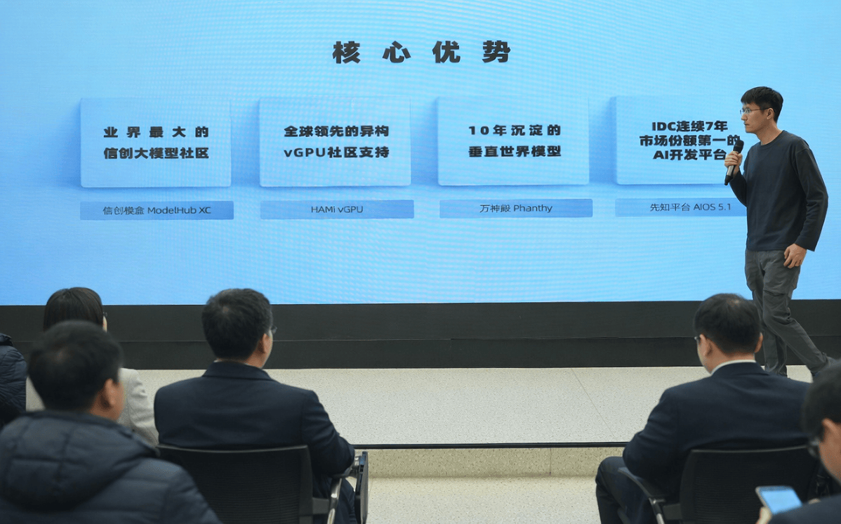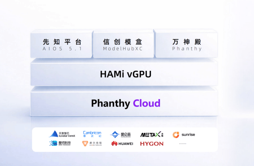 云层:无缝兼容公有云、私有云及混合部署模式,在保障弹性伸缩的同时,满足政企客户对安全、合规的刚性要求。算力层:集成高性能异构vGPU调度引擎,并获得全球活跃的算力管理社区HAMi支持,实现对GPU资源的精细化切分、隔离与统一调度。该设计显著提升在多团队、多任务、负载波动场景下的资源利用率与交付效率,让高昂的算力投入变得更具成本可控性。能力层:全面融入范式十年来自研积累的AI核心能力,具体包括三大支柱: