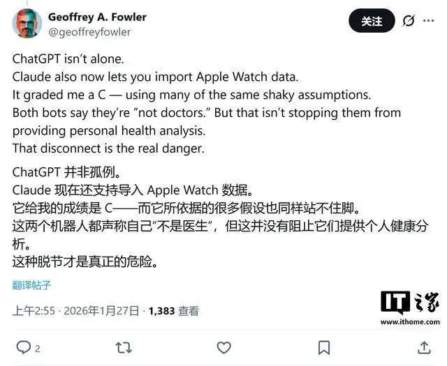 1 月 27 日消息,《华盛顿邮报》科技专栏作家 Geoffrey A. Fowler 测试 OpenAI 最新上线的 ChatGPT Health 功能,导入其十年积累的 Apple Watch 数据(含 2900 万步记录和 600 万次心跳测量),结果被错误判定心脏健康为“不及格”(F)。