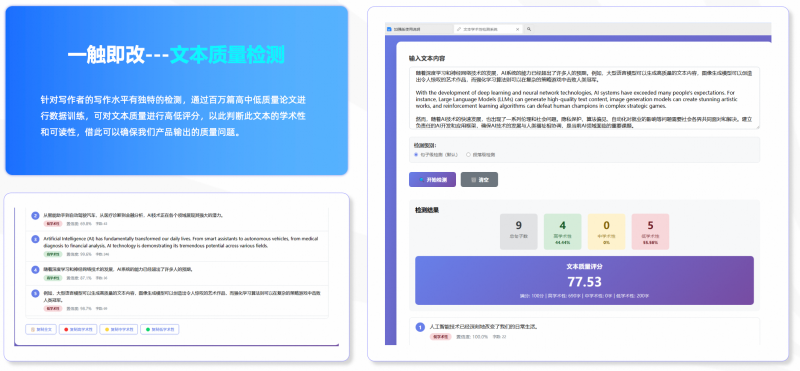 多维度质量检测:基于百万级高质量文本训练的AI模型,可对学术性、逻辑性、语言流畅度进行智能评分,为教育资源薄弱地区的学生提供实时反馈,辅助提升学术写作能力。