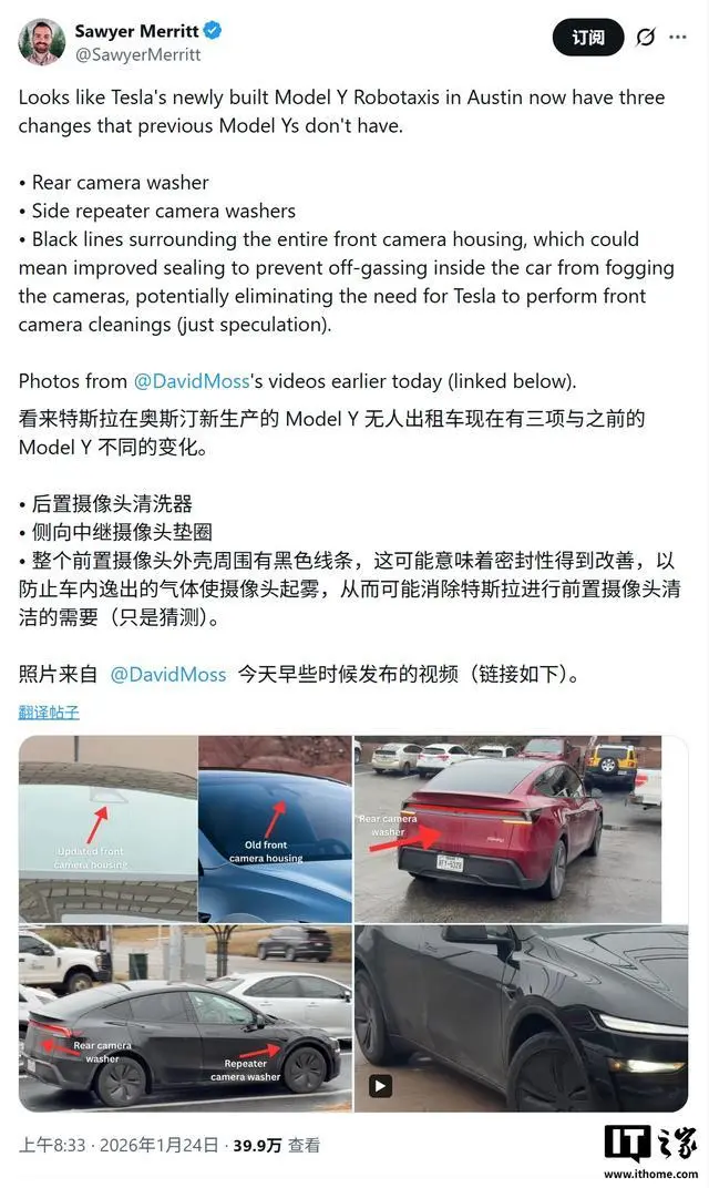 1 月 27 日消息,汽车媒体 notateslaapp 昨日(1 月 26 日)发布博文,分享了一组在美国奥斯汀抓拍的图片和视频,报道称特斯拉 Robotaxi 自动驾驶出租车车队已配备全套摄像头清洗系统。