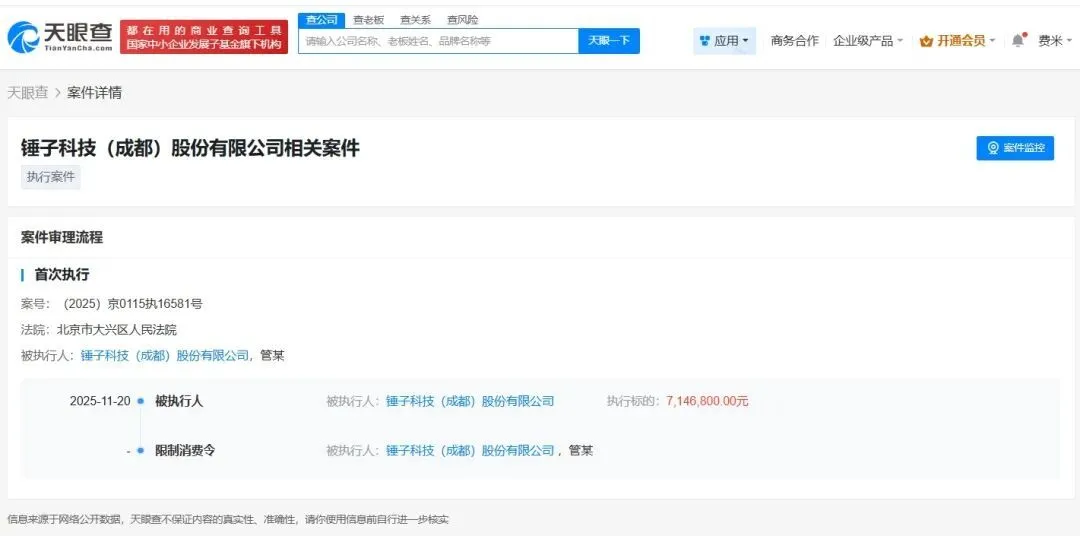 1月28日,天眼查天眼风险信息显示,近日,锤子科技(成都)股份有限公司及其法定代表人管志良新增一则限制消费令,执行法院为北京市大兴区人民法院。