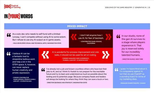 1 月 30 日消息,PC Gamer 今日报道,根据游戏开发者大会(GDC)最新发布的《2026 游戏行业现状》调查报告,超过半数的游戏开发者认为,生成式 AI 对游戏行业产生了负面影响,这一比例较两年前大幅上升。