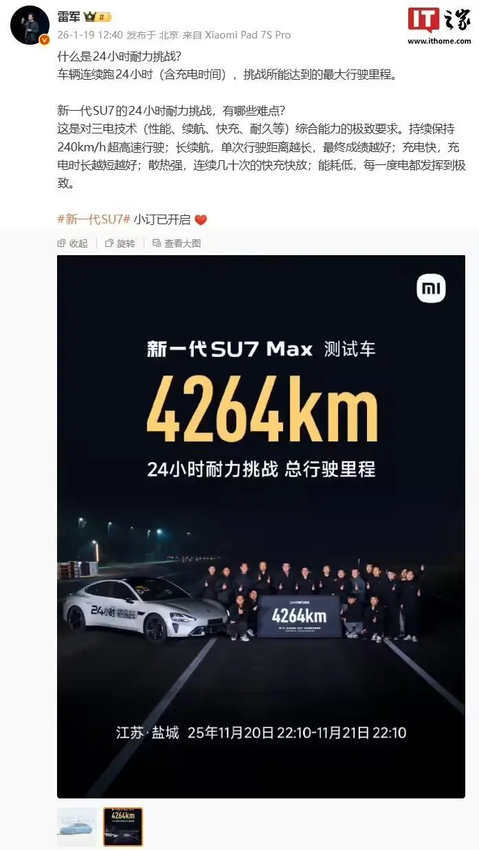 1 月 21 日消息,小米汽车昨晚发布了答网友问(第 208 集),针对什么是「24 小时耐力挑战」、为什么要做「24 小时耐力挑战」、「24 小时耐力挑战」为什么是对三电性能的极限考验等问题进行了解答。