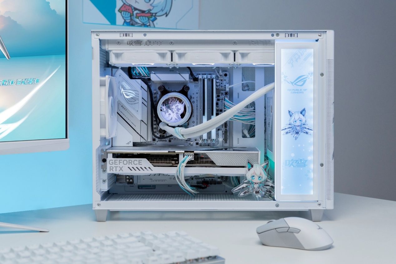 主板是整套主机的基石,十分重要。这里推荐的是吹雪家族新成员——华硕ROG B850小吹雪主板。其以突破性设计重塑电竞美学,加入雪武战姬主题元素,银白装甲搭配白色内存插槽和浅色PCB,白的彻底。再配合上支持神光同步的ROG LOGO,构建次元美学新标杆!该主板单品华硕商城到手价1569元,晒单还返50元红包。