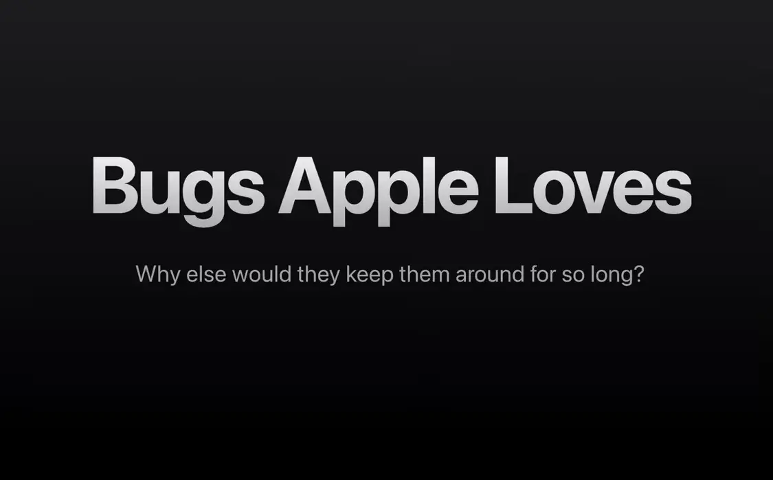 该网站的自我介绍为:一个讽刺性网站,记录由于苹果似乎太喜欢某些 Bug 以至于一直留着不修,人类因此浪费了多少时间。
