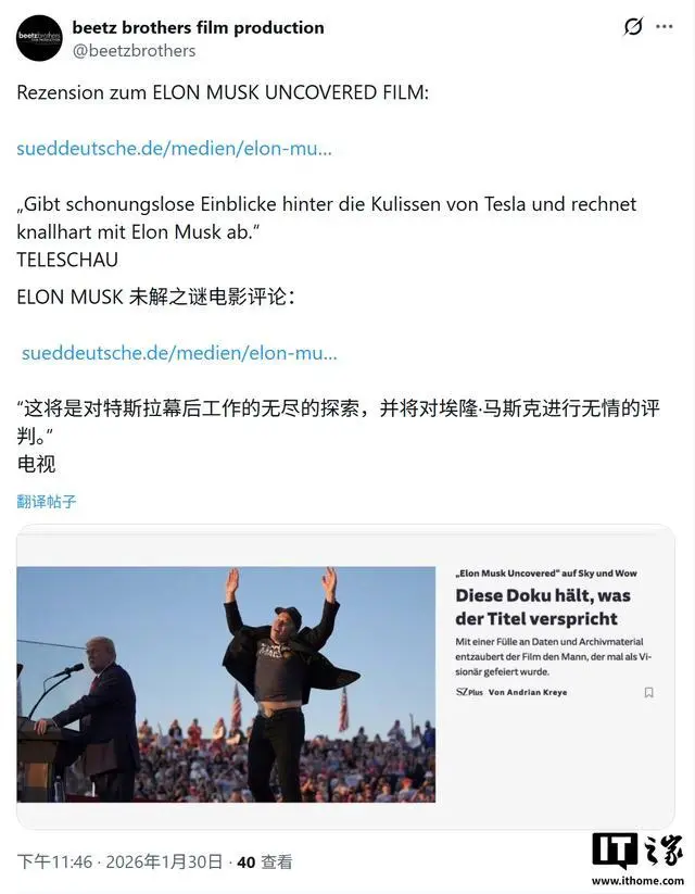 1 月 31 日消息,德国流媒体平台 Sky Deutschland 昨日(1 月 30 日)推出重磅纪录片《马斯克真相:特斯拉实验》(Elon Musk Uncovered: Das Tesla-Experiment),首次深度起底“马斯克体系”,揭露了特斯拉自动驾驶技术的安全隐患、数据掩盖行为等。