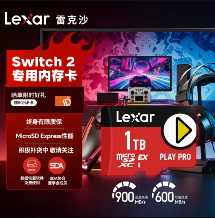 Lexar雷克沙的PLAY PRO microSD Express存储卡则是专为 Switch 2量身定制的存储利器。其读取速度高达900MB/s,写入速度600MB/s,能够确保游戏快速加载,避免因读取延迟影响沉浸式体验。容量方面提供256GB至1TB多种选择,其中1TB版本可存储约100个游戏,足以满足资深玩家的海量存储需求。
