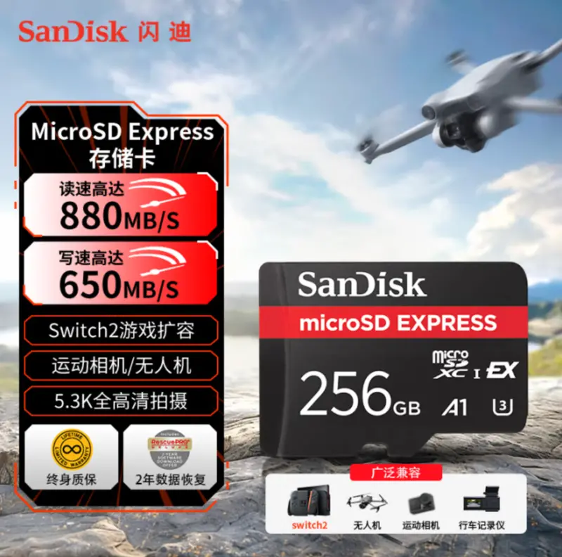 此外,产品提供两年的RescuePRO Deluxe文件恢复服务,搭配终身有限质保,让玩家使用时无后顾之忧,尽情沉浸于游戏世界。值得一提的是,除了游戏场景,SanDisk闪迪的microSD Express存储卡还适用于无人机、运动相机、行车记录仪等设备,凭借强劲性能为多元场景提供可靠存储支持。