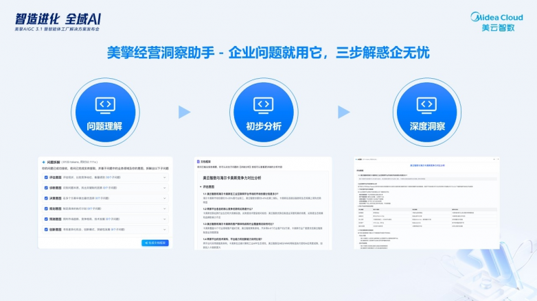 美擎经营洞察助手:用“数据看板+知识图谱”拆解经营问题,3步生成可落地的提效建议(如“库存周转率提升15%”)。