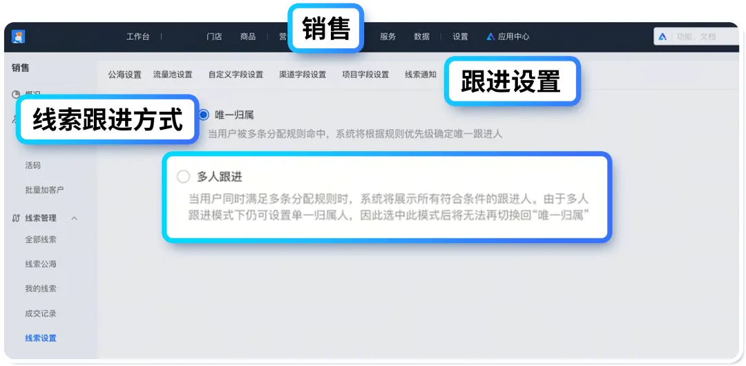即将上线的「CRM 支持多跟进人」功能,将构建灵活高效的线索协作中心,助力商家破解协同痛点。新增「跟进设置」入口,支持两种核心跟进规则:默认的「唯一归属」模式适配标准销售流程,确保线索责任明确;「多人跟进」模式可实现一条线索关联多位销售或客服人员,满足售前顾问、业务经理等多角色协同服务需求。