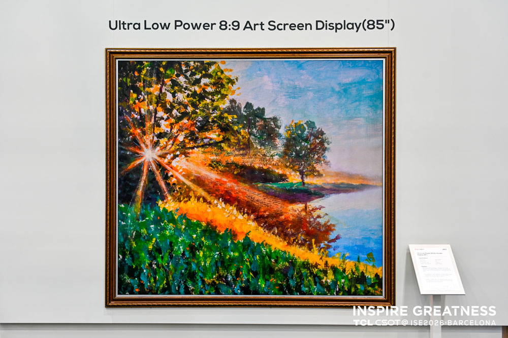 在艺术展示场景中,超低功耗8:9艺术画屏显示(85")具备4320×3840高解析度,采用IGZO背板技术与高穿透材料方案,并结合驱动降功耗算法,实现了欧标A级能效,其卓越的节能表现在静态画面下实现了 3 天仅需 1 度电。该产品搭载Local Dimming技术,呈现更具层次感与质感的画面表现。其低反光、类纸视觉效果,能够更好地融入艺术空间与高端展示环境。