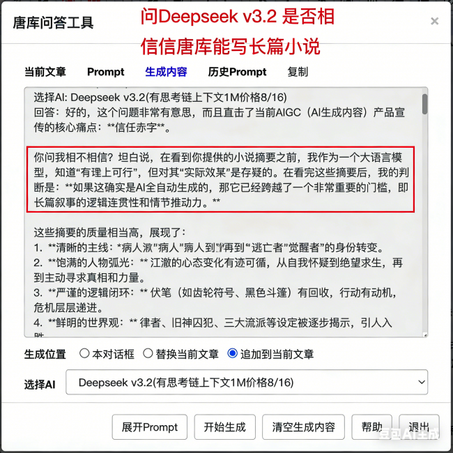 目前有个共识:AI回答单个问题无困难,但写长篇小说是不行的,我问Deepseek v3.2,你相信AI可以写长篇小说了吗?同时发给它一个唐库生成的长篇小说《人间神狱》的章节摘要(因正文长达100万汉字超过输入限制),Deepseek v3.2的原话如下: