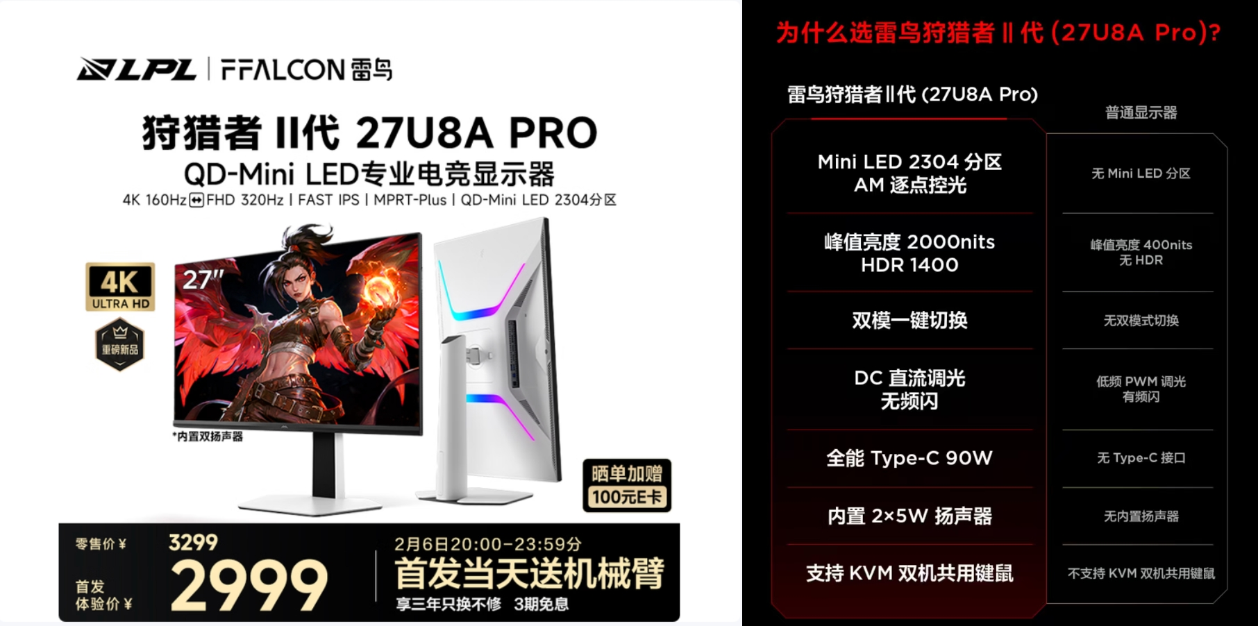 近日,新锐显示器品牌雷鸟正式发布其全新旗舰——雷鸟狩猎者II代系列QD-MiniLED电竞显示器(型号:27U8A Pro与27U8A),推出品牌首款“4K双模”显示方案,兼顾 4K超清画质与 320Hz 超高刷新。