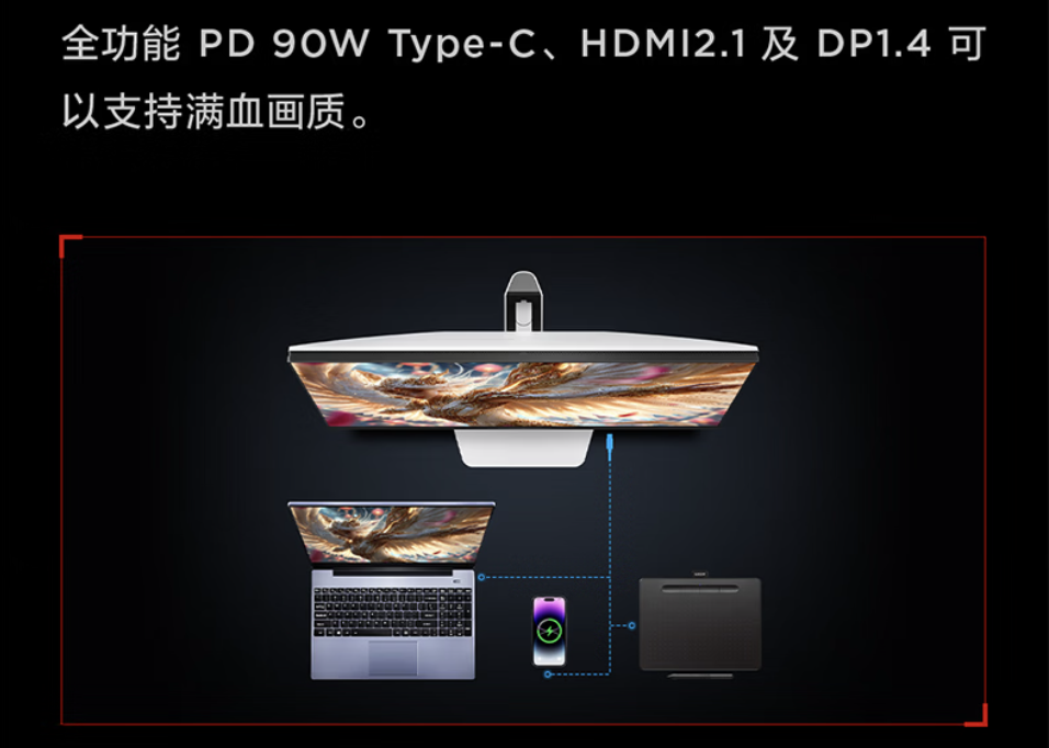 音频方面,其内置 2个5W高品质扬声器,无需外接设备也能提供沉浸的环绕声场。接口配置则充分考虑了下一代主机的需求与PC高端显卡的兼容性,提供了包括HDMI 2.1、DP 1.4在内的全功能接口,确保高带宽信号的无损传输,充分发挥双模显示的潜力。