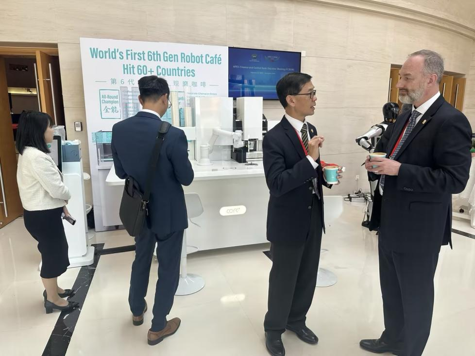 上海,2026年2月5日电(本报记者 陈艾茗)当财政部副部长廖岷宣布APEC财政和央行副手会顺利闭幕时,位于上海国际会议中心一层休息区的“特殊服务生”——全球首台第六代COFE+全智能机器人咖啡亭,也刚好完成了它的第327杯饮品制作。一杯印有APEC会徽拉花、香气醇厚的拿铁,被递到了刚刚结束一天密集磋商的贵宾手中。他轻啜一口,略显疲惫的脸上露出惊讶与轻松的神情:“难以置信,这口感比我每天在酒店咖啡馆喝到的精品咖啡味道还好,太神奇了。”