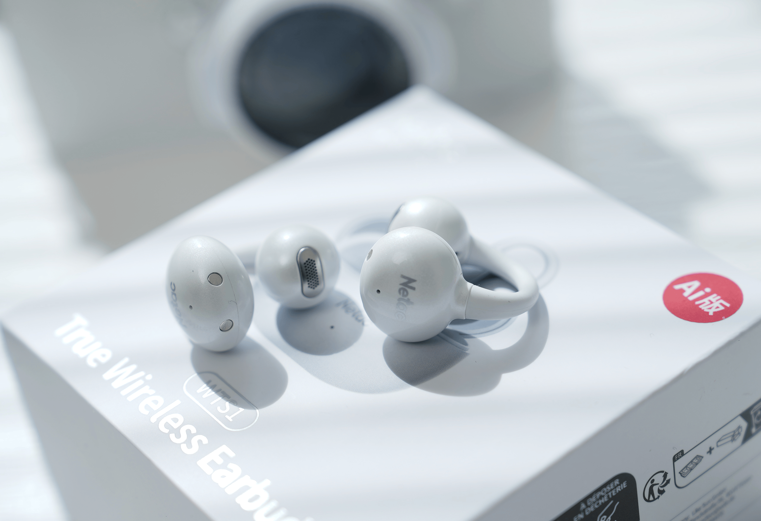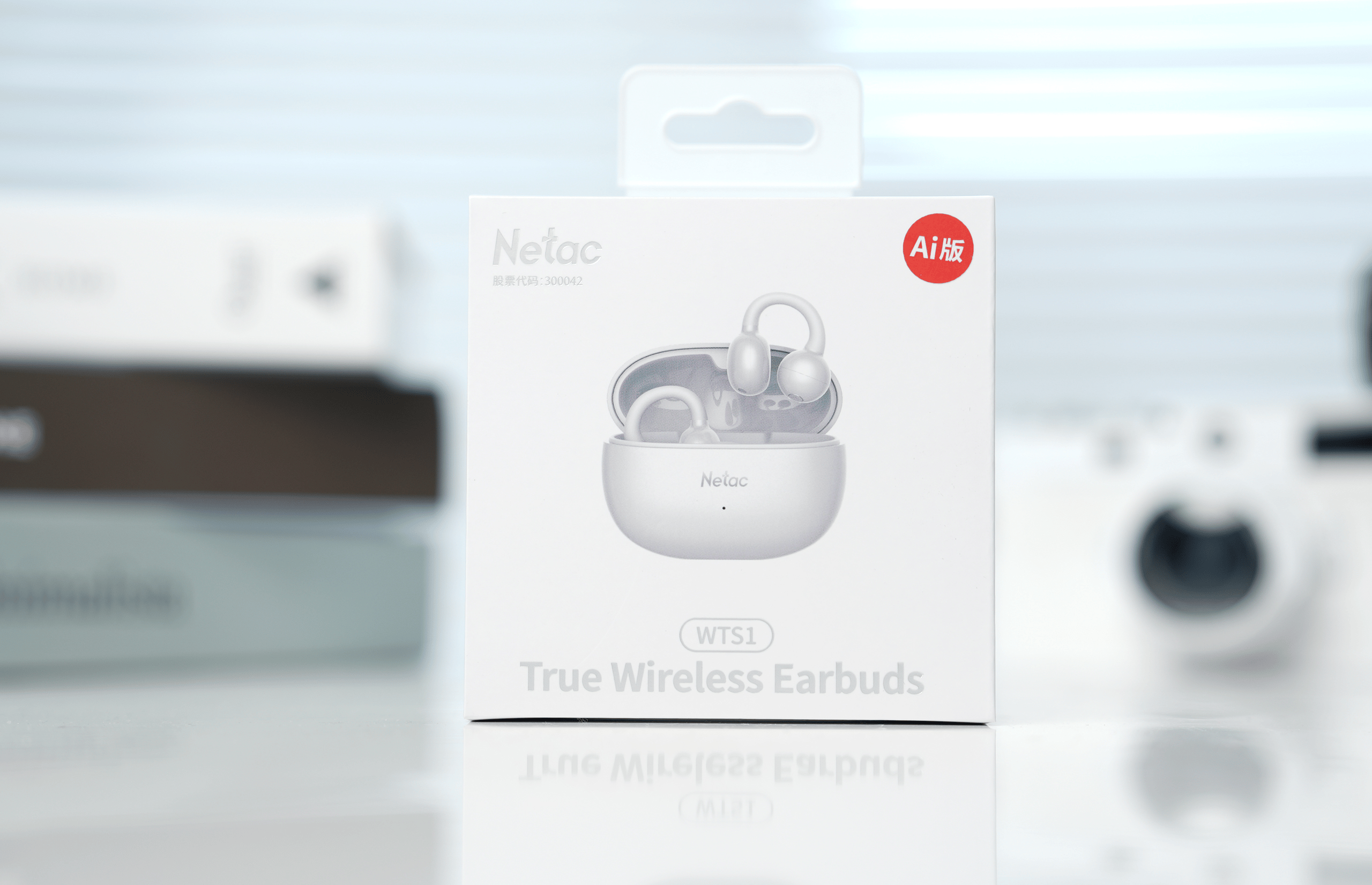 外包装以白色调为主,采用极简风格设计,正面是耳机和充电仓的产品图,下方标注型号 WTS1,右上角一个醒目的「AI版」标识,直接点明核心卖点。