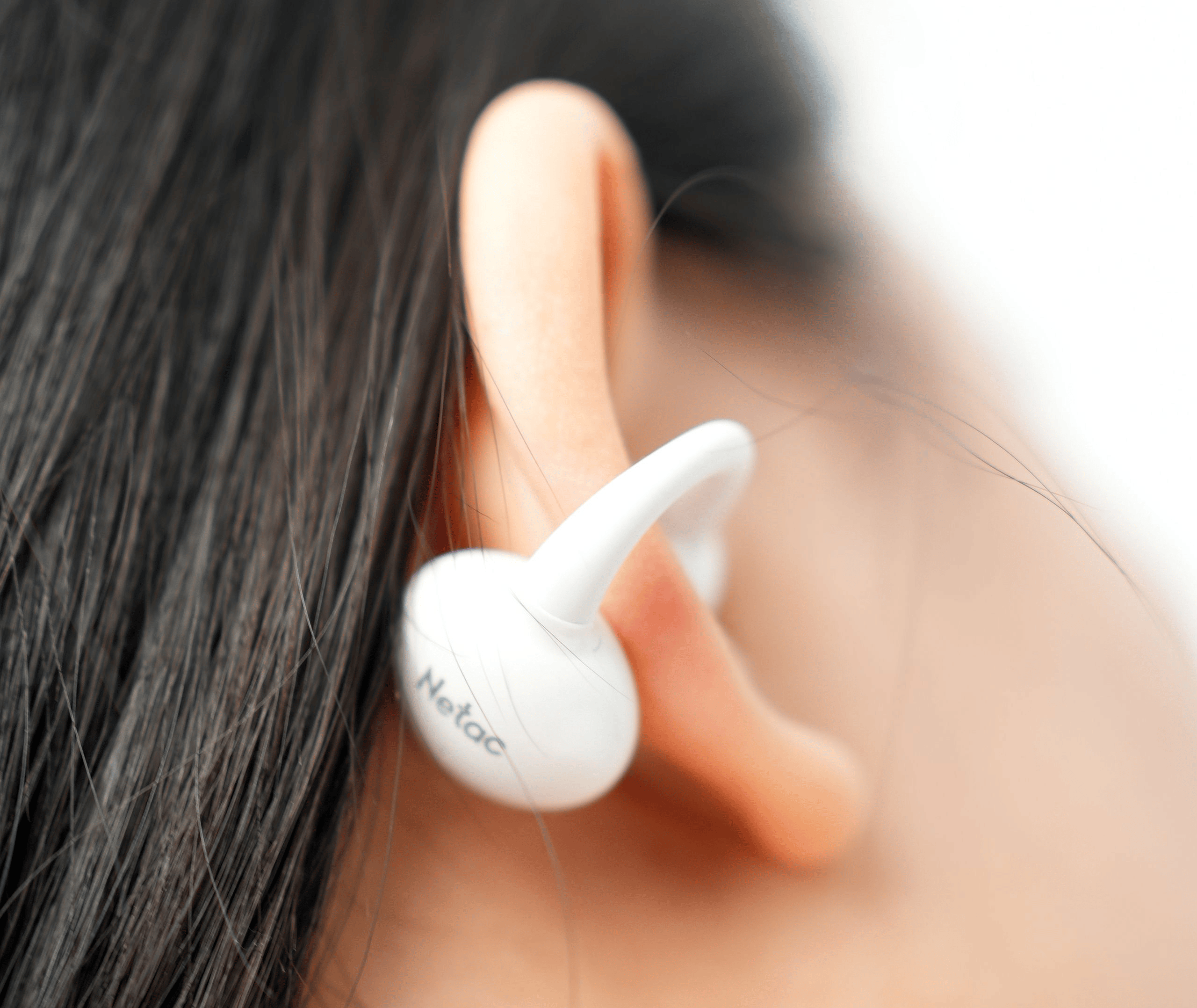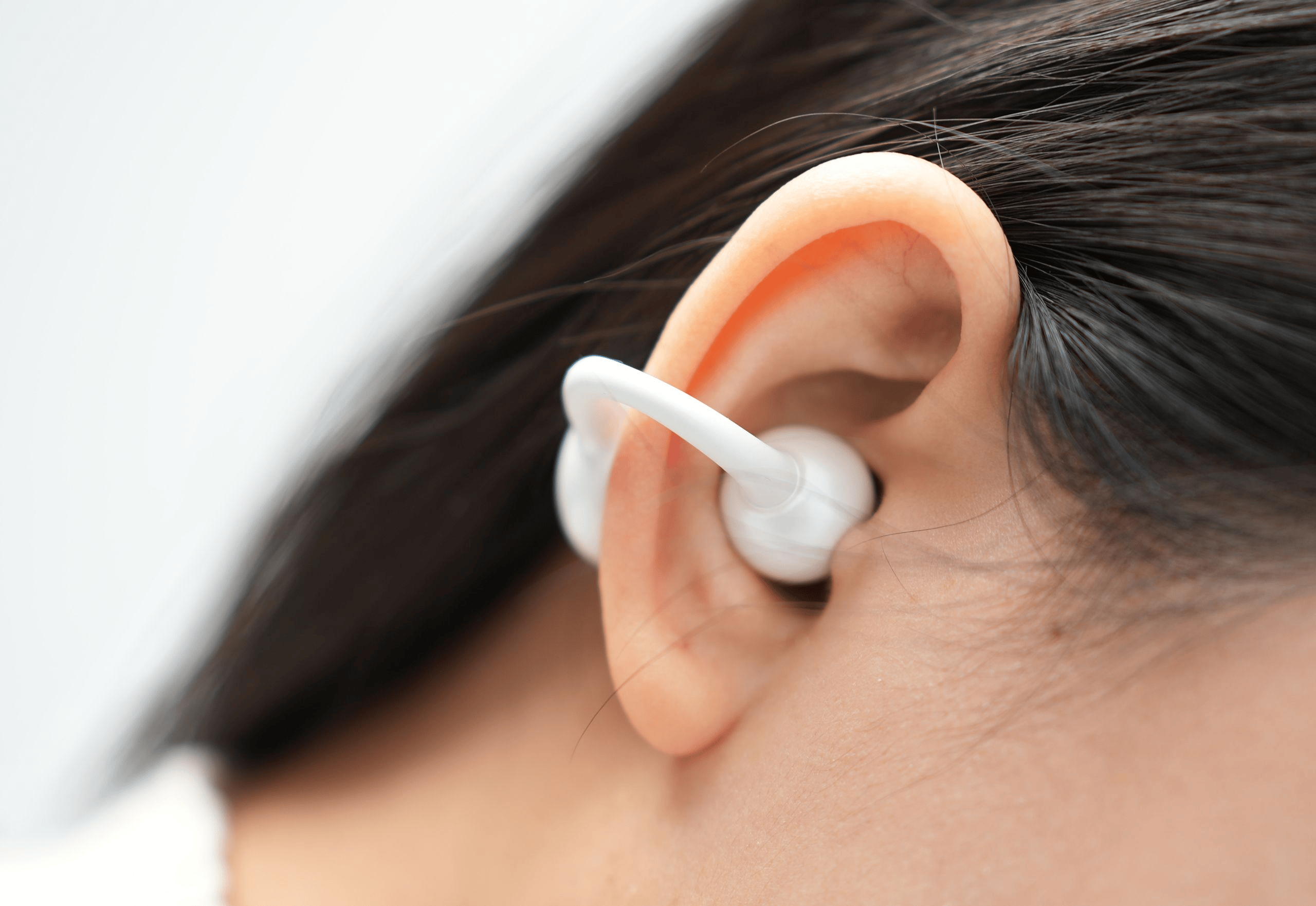 朗科 WTS1采用不入耳式设计,通过「三点全向支撑结构」与「仿生耳蜗形态」,让耳机并不是“塞”在耳道里,而是自然贴合在耳廓外侧。这样的结构思路,本质上是把受力点分散开来,避免传统入耳式耳机长时间佩戴后,对耳道内壁产生持续压迫,从源头上减少闷胀感和不适感。
