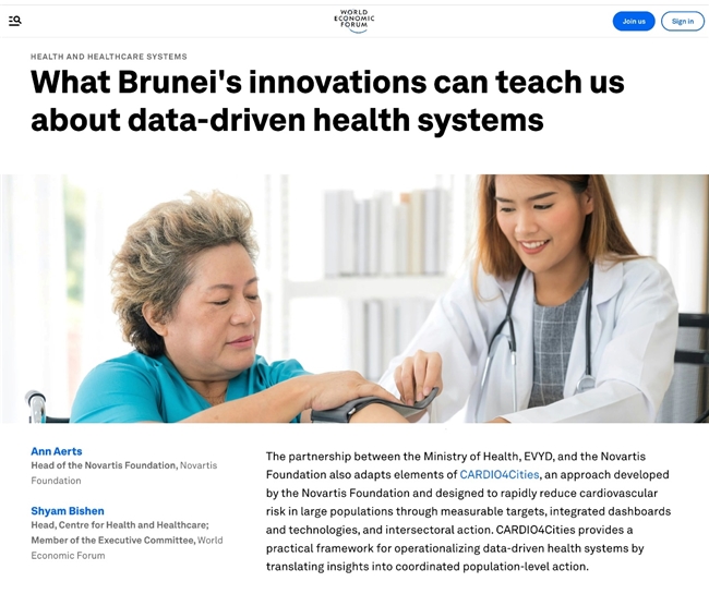 世界经济论坛官网发布文章“What Brunei's innovations can teach us about data-driven health systems”(《文莱创新实践:迈向数据驱动型医疗体系》)。文章深刻剖析了全球非传染性疾病防控面临的共性难题,聚焦文莱卫生部、医渡科技旗下EVYD公司与诺华基金会将联合实施的心血管疾病防控项目“CARDIO4Cities”,重点解读了文莱如何以BruHealth平台为核心,通过数据驱动、跨方协同,推动卫生系统从被动应对向主动预测转型。在刚刚结束的2026冬季达沃斯论坛上,诺华公司董事会主席Giovanni Caforio博士宣布了这项重要合作。BruHealth由EVYD助力打造,公司将依托自身数智技术与项目实践经验,承担本次项目核心的数据整合、分析及技术支撑工作,并持续推动精准公共卫生、AI健康洞察等前沿应用,让技术进步真正普惠大众。