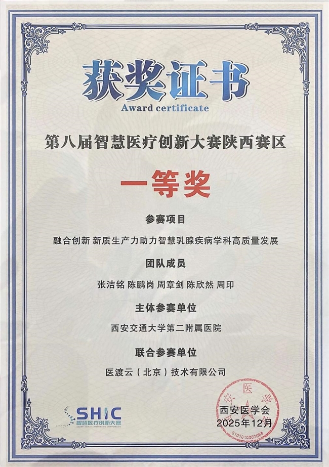 医渡科技与西安交通大学第二附属医院(西北医院)联合申报的 “融合创新 新质生产力助力智慧乳腺疾病学科高质量发展”项目,荣获第八届智慧医疗创新大赛陕西赛区一等奖。此次获奖是以 “数据要素”驱动优势专科高质量发展的又一次成功实践。截至目前,医渡科技已于全国性行业大赛中累计荣获20+奖项,持续彰显公司AI医疗创新深厚实力。