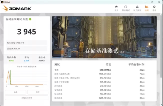 英韧IG5222版梵想S790 2TB在3DMark存储基准测试中获得3945分,从整体成绩分布来看属于高端水平。