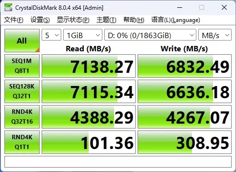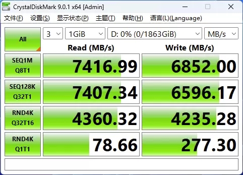 下图是AMD锐龙7000平台上的CrystalDiskMark测速成绩,顺序读取速度达到7400MB/s以上。
