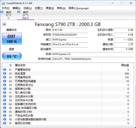 本次评测的梵想S790 2TB搭载了6.W.1.4H版本固件,使用PCIe 4.0 x4接口,支持NVMe 2.0协议。