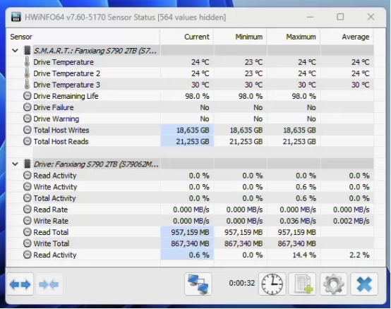 温度表现的核心就是关注满载压力测试下SSD的表现。通过HWiNFO64每秒记录的数据可以看到,英韧IG5222版梵想S790 2TB在15分钟的满载压力测试中始终保持全速运行,未发生过热限速。