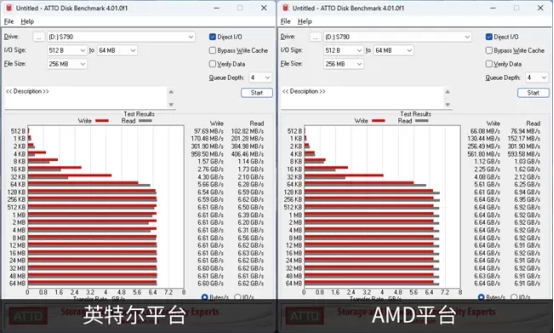 ATTO使用1024进制,存储厂商和CrystalDiskMark都使用1000进制。折算到1000进制后,上图中英特尔平台的顺序读取带宽大约为7.1GB/s,AMD平台的顺序读取带宽大约为7.4GB/s,达到了各平台的理论带宽上限。