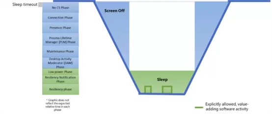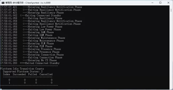 PwrTest会控制电脑完成现代待机各个阶段的进出测试,从No CS阶段(屏幕关闭后开始),连接阶段(确认没有远程桌面会话),线程生命周期PLM阶段(暂停所有前台Microsoft Store应用),维护阶段(执行系统维护任务),桌面活动调节器DAM阶段(暂停所有桌面应用),低功耗阶段(通知进入低功耗长恢复延迟阶段),弹性通知阶段(通知网络子系统进入低功耗模式),*后到达弹性阶段(DRIPS,即*深运行时空闲电源状态)。