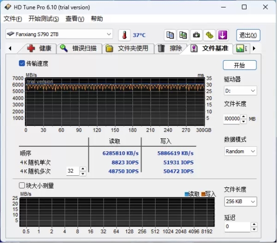 重新建立分区并格式化,利用IOMeter向盘内填充1024GB不可压缩数据,充分闲置等待缓存释放。然后使用HDTune进行文件基准测试,可以看到此时英韧IG5222版梵想S790 2TB依然具备超过300GB的写入缓存空间。
