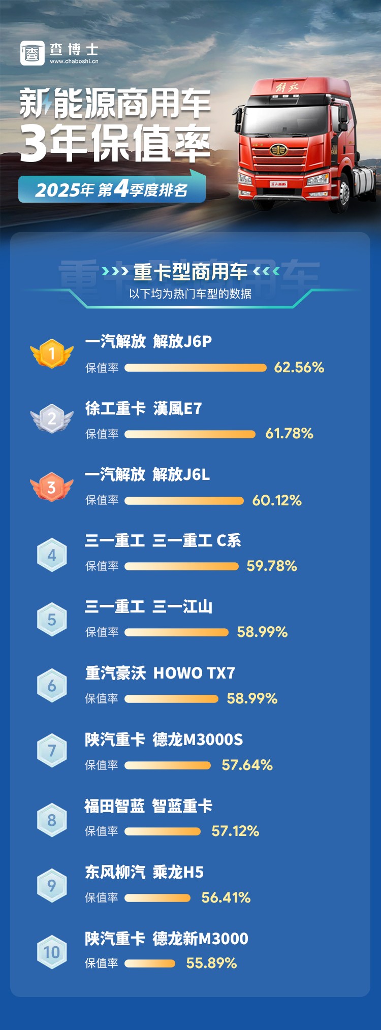 在“双碳”目标持续推进与物流行业电动化转型加速的背景下,新能源商用车的保值率已成为衡量车型市场认可度、技术成熟度与残值能力的核心指标。本报告基于查博士发布的2025年第4季度数据,对轻卡、中卡、重卡三大细分市场的3年保值率表现进行深度解析。