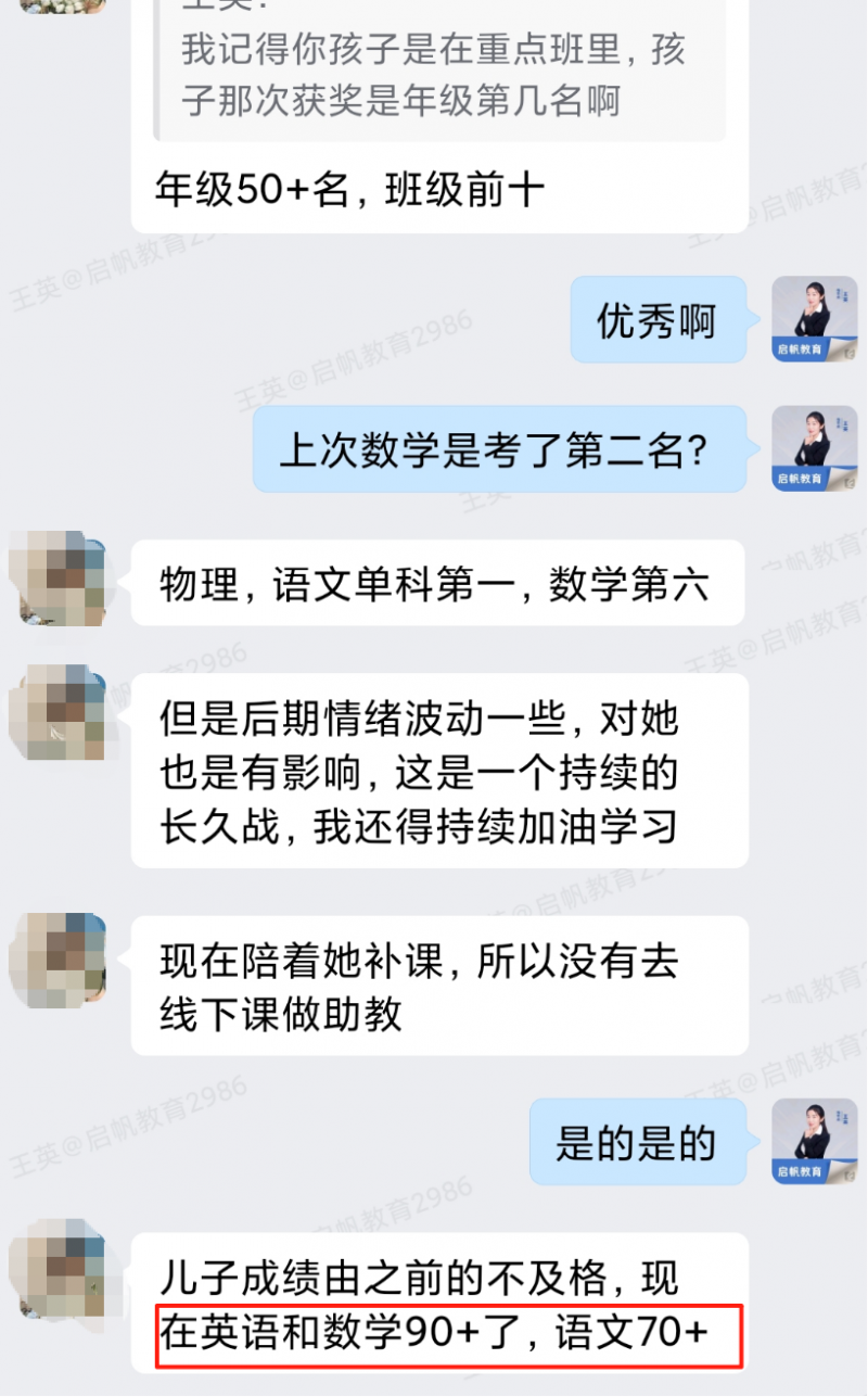 在她的指导生涯中,有一个学员的改变令人印象深刻:学员家中有两个孩子,她的女儿曾休学一年,亲子关系也陷入僵局,小儿子的成绩更是常年不及格,家庭里满是焦虑与无奈。在王英老师的耐心陪伴与专业指导下,这位家长先实现了自我成长,而这份改变也悄然影响着孩子——休学的孩子成功重返校园,更是考出了班级前五的好成绩,小儿子的成绩也实现质的飞跃,平均分稳定在90分以上。这份惊喜的蜕变,让学员深深感慨:原来家长的自我成长,才是孩子最好的成长范本。而这样的蜕变,正是王英老师用共情与专业,为家庭点亮的光。