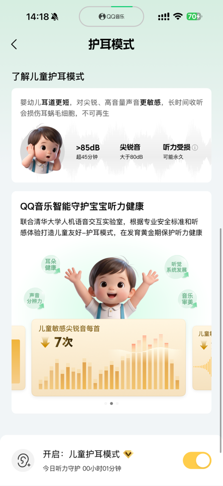 为保护儿童的听力,腾讯音乐天琴实验室联合清华大学人机语音交互实验室推出“儿童护耳模式”,在QQ音乐上线。QQ音乐在保持音乐和有声内容完整性性前提下,减轻在易受损频段的听力负担,减少突兀高音与爆鸣带来的脉冲损伤,同时以臻品母带级无损音质还原被压缩抹去的高频细节与低频厚度。在该模式下,音质平均提升43%,儿童敏感尖锐音每首平均降低7次,儿童敏感频段音量平均降低2.5dB。