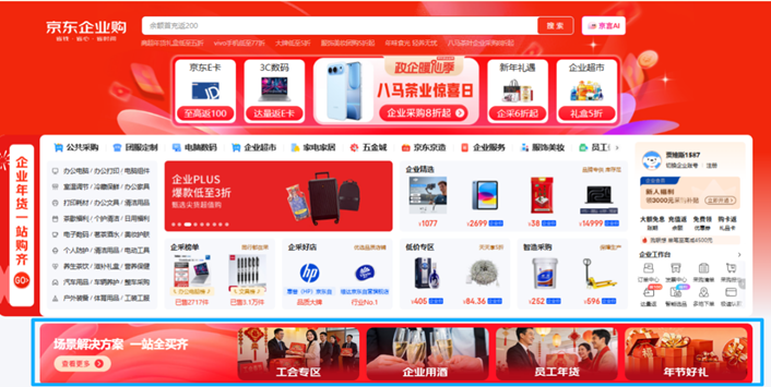 在政策引导与市场需求双重驱动下,企业福利采购、年货礼赠等需求集中释放,京东企业购针对员工福利、商务礼赠等高频场景,打造了年货节场景解决方案,将京东平台的标准化产品能力,转化为“省心、高效、有温度”场景化服务,汇聚成“年货节采购工具包”,显著降低企业数字化采购门槛,实现从单纯“卖商品”到深度“卖服务”的转型。