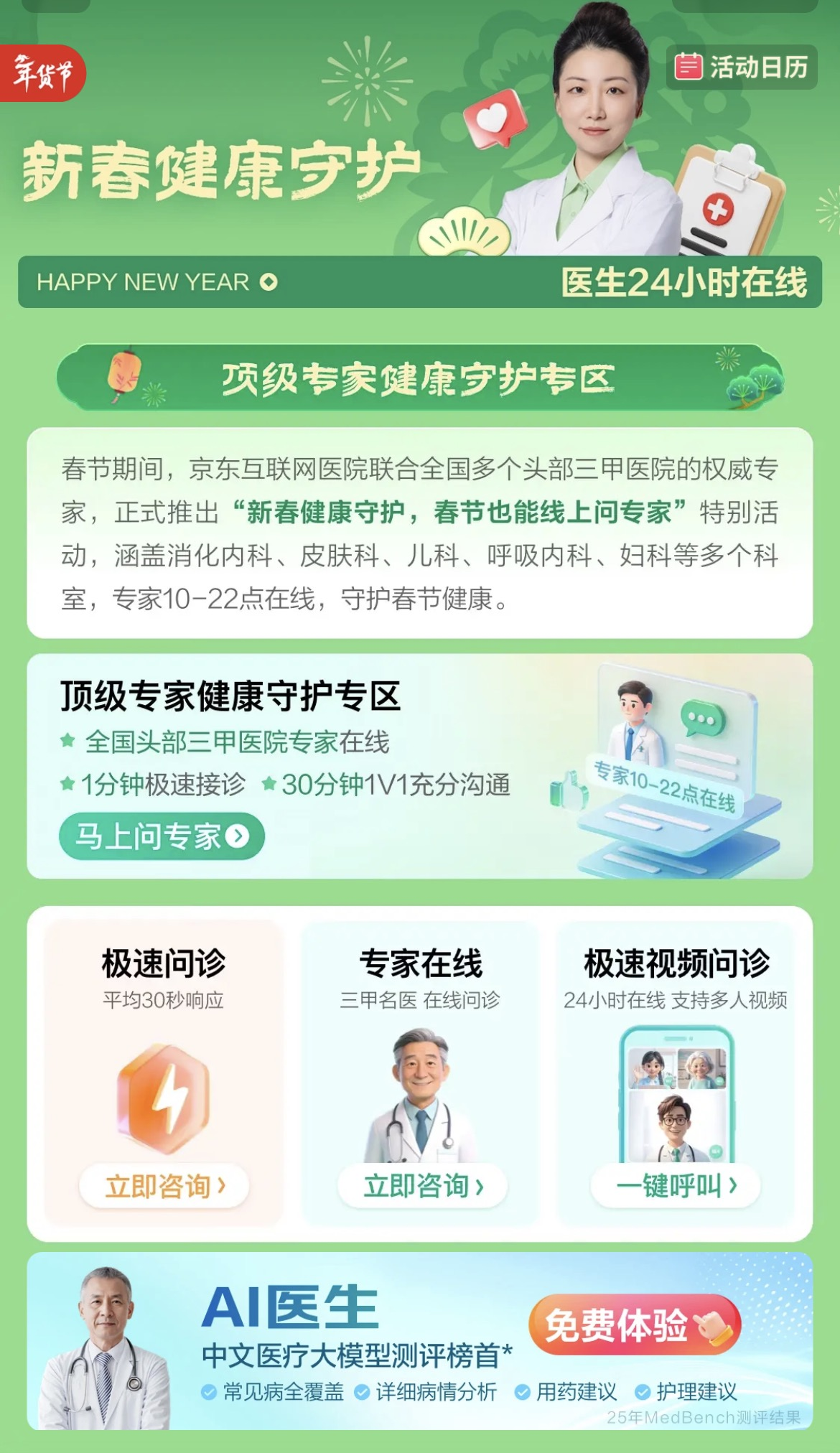 2026年春节临近,为保障千家万户安心团聚、健康相伴,2月10日起,京东互联网医院的“新春健康守护”活动重磅加码,联合全国多家头部三甲医院的权威专家,在春节期间持续提供线上健康咨询服务,让专业医疗支持随时可及,陪伴用户温暖过年。