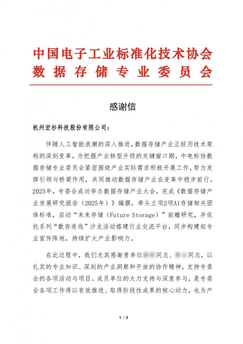 近日,中国电子工业标准化技术协会数据存储专业委员会(下称“专委会”)向宏杉科技发来感谢信,对宏杉科技在2025年数据存储产业创新与发展中所作出的重要贡献表示高度认可。