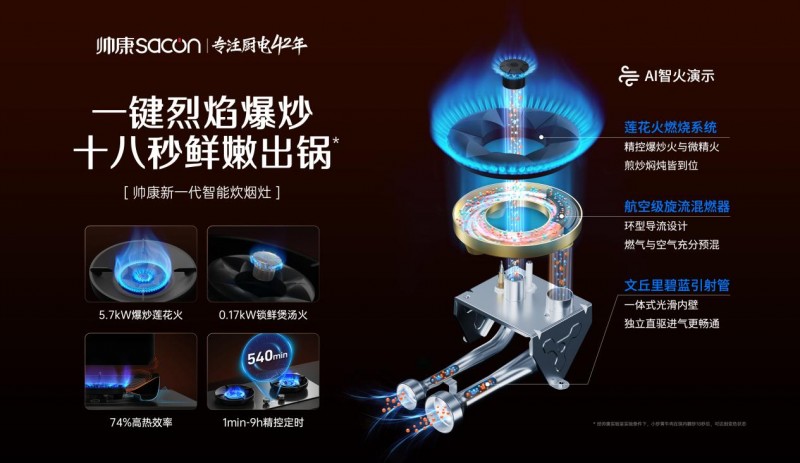 团圆饭硬菜云集,火力不足会导致烹饪效率低、菜肴口感差,难以复刻记忆中的“锅气”。帅康炊烟灶采用独创极焰莲花火技术,一键爆炒火力可达5.7kW,较传统灶具大幅提升,十八秒鲜嫩出锅,轻松驾驭中式爆炒;0.17kW-5.7kW超宽火域,微火慢炖可煨制靓汤,满足团圆饭多样化烹饪需求。同时,热效率高达72%,远超国家一级能效标准,做到猛火不费气、高效又节能,成为油烟机家用搭配的黄金伙伴。