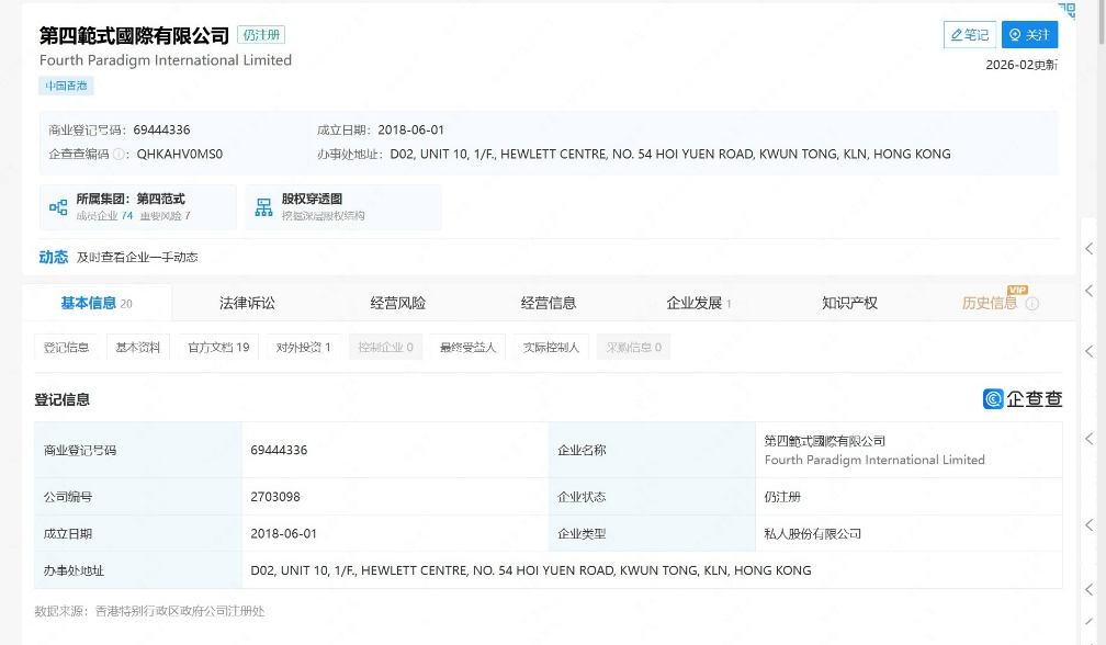 香港,2026年2月13日 —— 近日,记者在查询香港公司注册处公开资料时注意到,一家名为“星际智子有限公司”(Sophon Development Co., Ltd.)的企业于近期完成注册,注册资本1亿港币,唯一股东为第四范式国际有限公司。目前,该公司尚未对外披露业务范围或团队信息,但其名称与股东背景却已引发业内对其潜在战略方向的揣测。