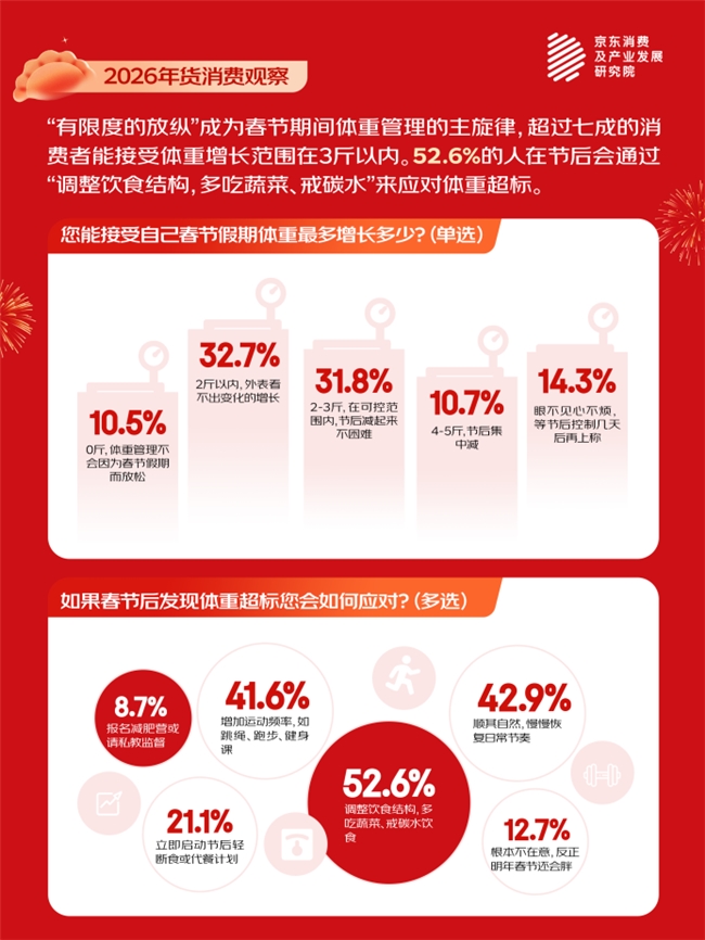 每逢佳节胖3斤,胖上3斤又何妨?如果说年夜饭是味蕾的盛宴,那么随之而来的体重焦虑则是许多人心中的隐忧。今年的调研揭示了一个有趣的现象:人们对体重管理的态度是一种 “有计划的放纵”,是更为成熟和松弛的“动态平衡”哲学。