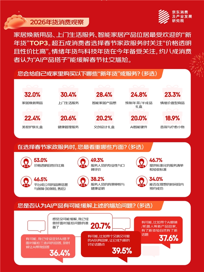 · 近年来,毛绒玩具、盲盒、香薰等“情绪价值型年货”日益受到消费者青睐。44.9%的受访者认为此类商品“有助于在假期中获得放松与愉悦”,42.8%的受访者则表示“能够增添节日氛围与仪式感”。与此同时,随着AI产品逐渐成为新年货,其在情绪调节方面也展现出新的价值,例如“缓解社交尴尬”等。试想,每年春节可能会有哪些令人紧张的话题?比如:“赚了多少钱?”、“怎么又胖了?”、““有对象了吗?”、“什么时候结婚?”、“孩子成绩怎么样?”等等。而今年有意思的新变化是:79.3%的受访者认为AI产品有望缓解此类尴尬情境,并对AI在社交场景中的应用持积极态度,其中“又萌又可爱的AI玩具”最受青睐,AI眼镜或机器人等新型硬件则紧随其后。