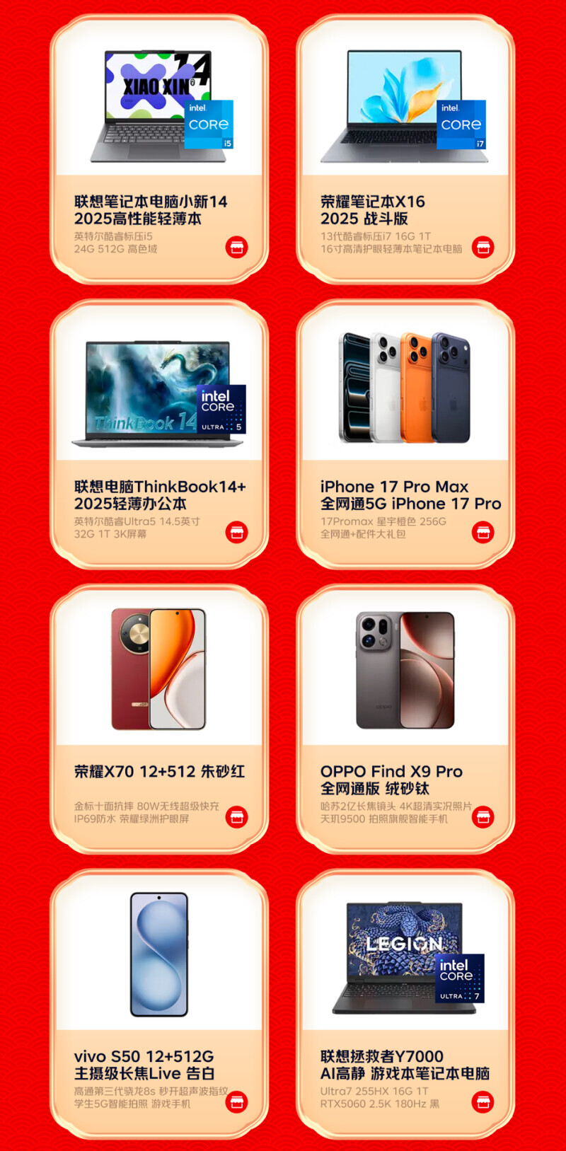 在这个注重团圆与分享的节日里,无论是为家人挑选一份心意,还是为自家换新添置设备,京东之家都准备了丰富的产品选择。联想笔记本电脑小新14 2025高性能轻薄本、ThinkBook 14+ 2025轻薄办公本、荣耀笔记本X16 2025战斗版,兼顾效能与便携,是学生与职场人的优选;荣耀X70 朱砂红配色喜庆大气,vivo S50 搭载主摄级长焦,记录团圆时刻更清晰;OPPO Find X9 Pro 绒砂钛质感高级,iPhone 17 Pro Max 强劲性能,皆是礼赠佳品。
