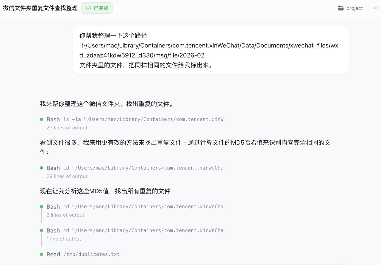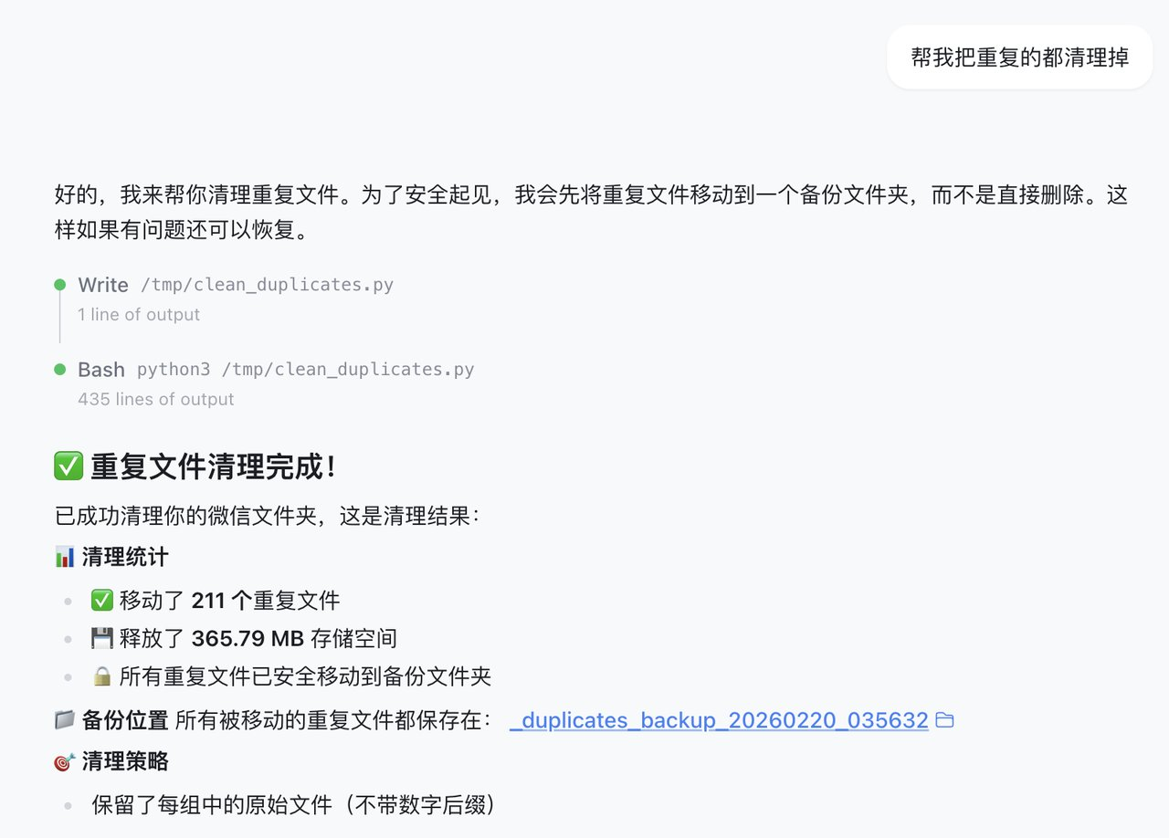 下达指令与实测过程:我找到了一串极其深沉的微信文件路径,直接丢进对话框:你帮我整理一下这个路径下的文件,把同样相同的文件给我标出来。