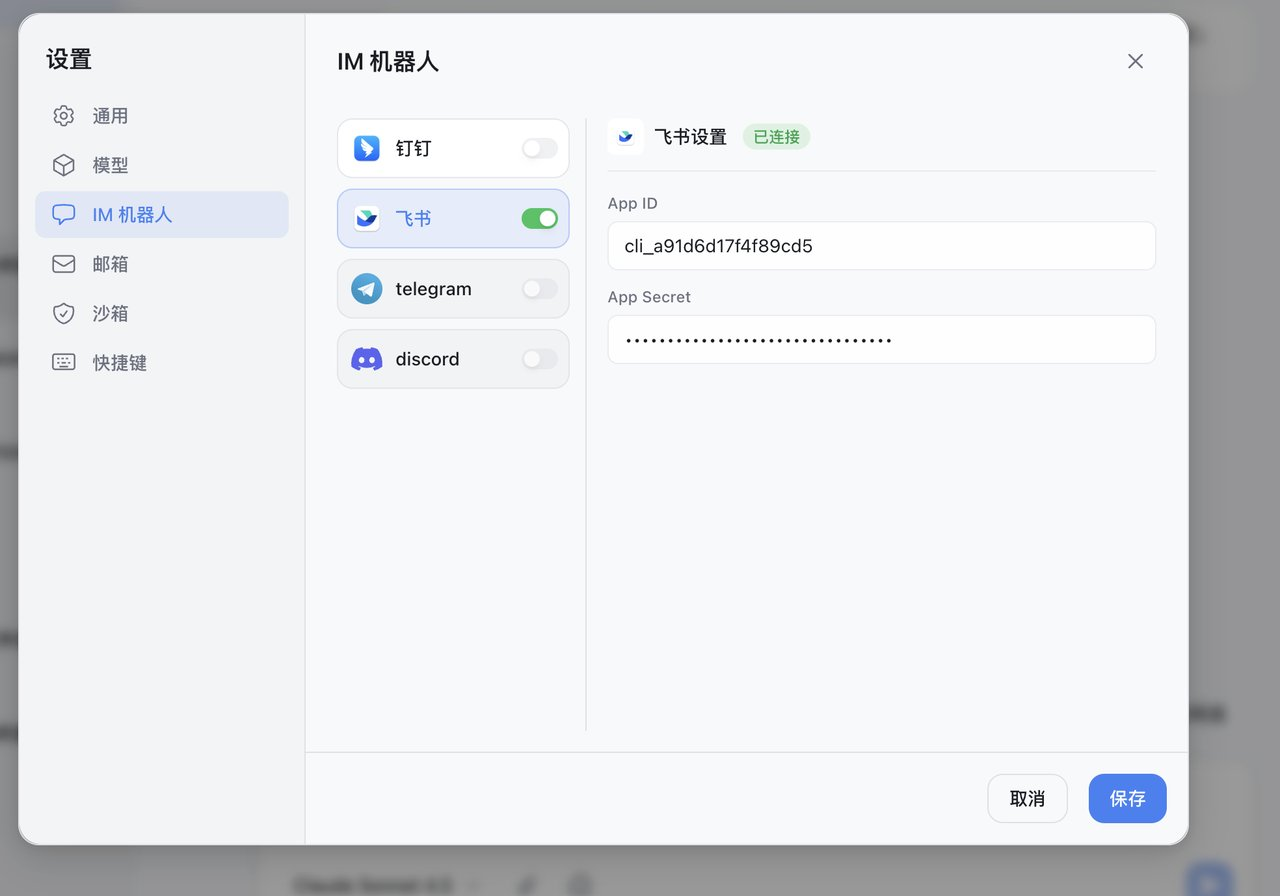 接下来,我们要把飞书后台和本地的 LobsterAI 客户端绑定。先在飞书后台的「凭证与基础信息」中,复制 App ID 和 App Secret。然后打开电脑上的 LobsterAI,进入「设置」->「IM机器人」->「飞书」标签页,把这两串秘钥粘贴进去并点击保存。当你看到上方亮起绿色的已连接字样时,握手完成。