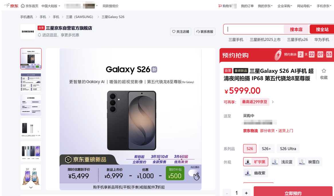 想要换新三星Galaxy S26系列,那就快来京东预约吧,先人一步下单还可享3月6日起优先发货等福利。