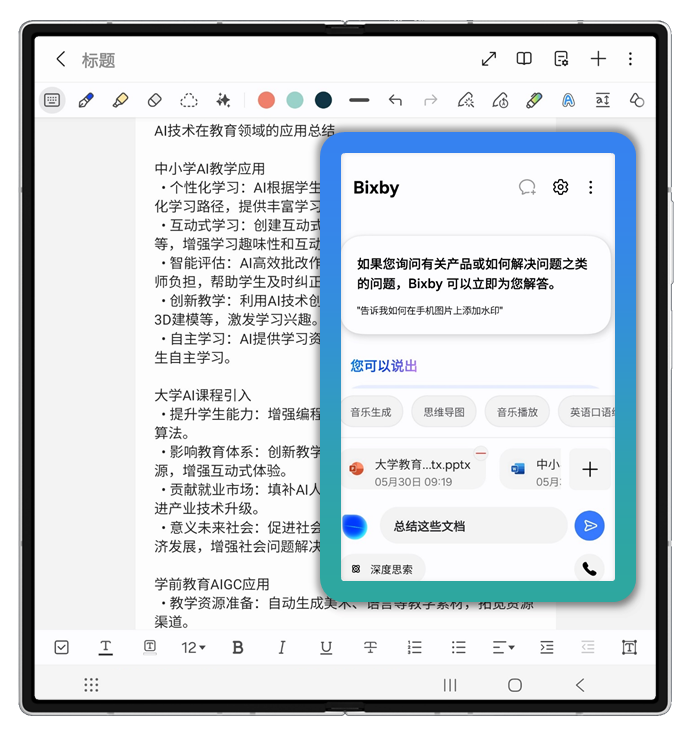 不仅如此,深度整合的Galaxy AI功能进一步抬升了三星Galaxy Z Fold7的智慧办公体验。例如,跨国出差时,三星Galaxy Z Fold7搭载的即时翻译、同传等功能,让语言不再是交流和理解的障碍;会议中,转录助手能迅速将语音实时转录成文字,并区分不同的发言人,将内容一一整理归纳,Galaxy AI还可根据录音内容,为用户提供日历、闹钟、提醒和日程推荐等;在文档处理上,Bixby更是你的超级秘书:面对长达百页的合同或研报,无需逐字阅读,利用AI就能瞬间生成思维导图与核心摘要。这些AI功能让信息的获取更快速简单、工作的处理更便捷高效。