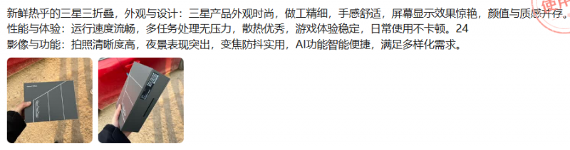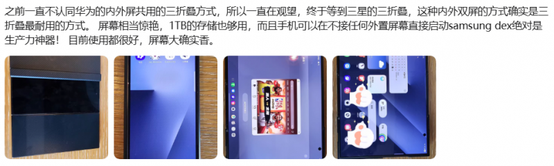 三星Galaxy Z TriFold的独特形态也让部分消费者对其便携性和耐用性有了疑虑,针对这方面,用户也有着自己的见解。“折叠状态下小巧便携”“展开状态机身最薄处仅3.9毫米,用机手感很舒适”“内外双屏的方式确实是三折叠最耐用的方式”等评价就给出了答案。