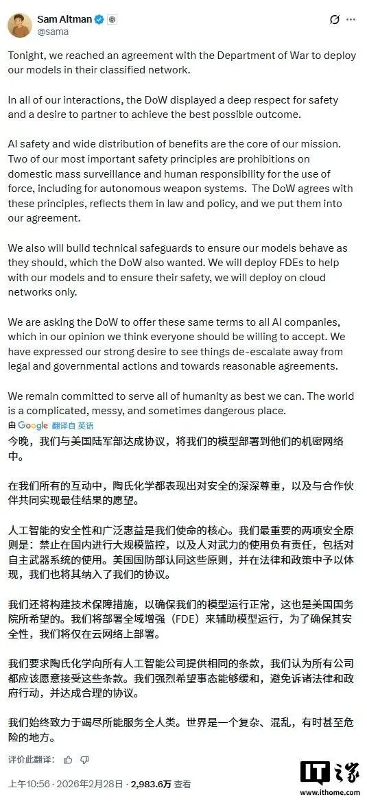 OpenAI 首席执行官萨姆 · 奥尔特曼昨晚在 X 平台发文称,其公司已与美国战争部达成协议,“将我们的模型部署到他们的机密网络中”。他还表示:“在所有沟通中,战争部都表现出对安全的高度重视,以及希望通过合作实现最佳结果的意愿。”